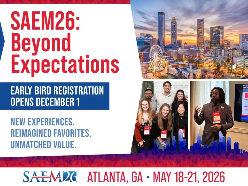 The SAEM Annual Meeting is the premier forum for the presentation of original education and research in academic emergency medicine. Get ready for our most comprehensive and dynamic meeting yet, featuring new and reimagined experiences that expand your learning, strengthen your connections, and elevate the value of your registration. We’re bringing you everything you love — plus fresh ideas and innovations that set a new standard for excellence and value, delivering an experience that truly redefines what it means to go beyond expectations.