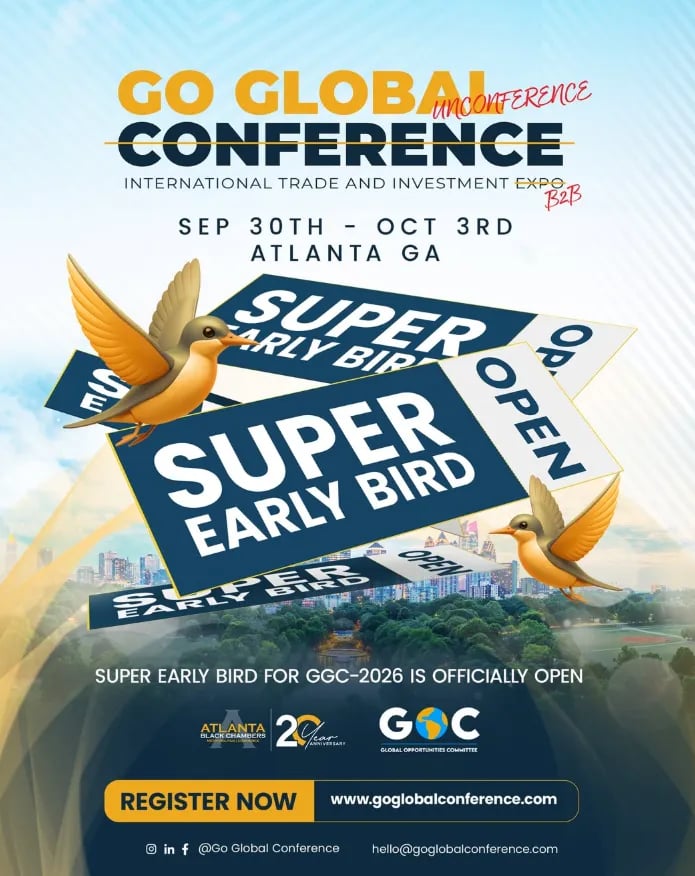 The Go Global Conference 2026 is the third annual iteration of Atlanta’s premier international business and trade expo, designed to help companies make real global connections through strategic B2B matchmaking, curated networking, executive plenaries, and guided business site visits. Running September 30 – October 3, 2026 in Atlanta, the four-day experience mixes welcome receptions, structured 1:1 matchmaking meetings, plenary sessions with trade and policy leaders, and on-the-ground site tours of Atlanta’s innovation and trade corridors. It’s tailored to business leaders, entrepreneurs, investors, exporters, and trade professionals seeking new international partners, investment opportunities, or market entry strategies, especially within the Global Black Business community and multicultural business networks. Registration is available with early-bird pricing starting around $100, giving attendees access to focused deal-making, networking, and global market insight.